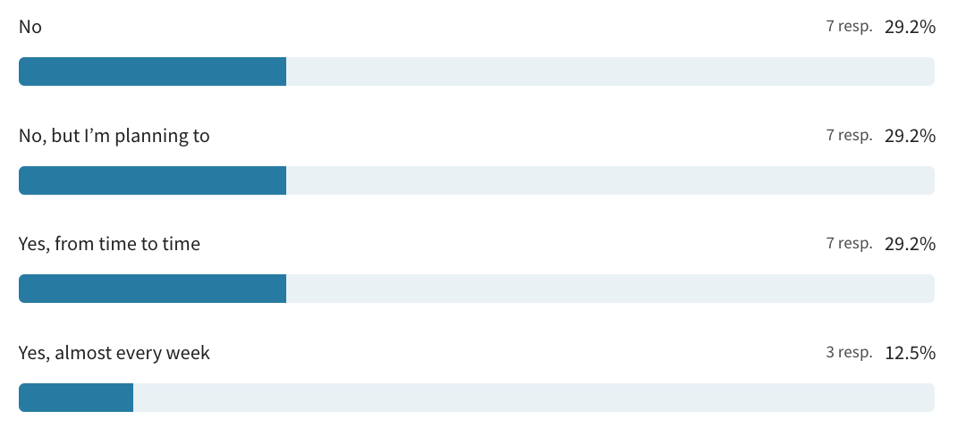 Falco's community calls are an essential part of its communication strategy, allowing users to connect and collaborate with other members of the community. The survey asked participants whether they attend these calls, with 24 out of 24 respondents answering. The results showed that a majority of respondents do not attend the weekly community calls, with an almost equal number of respondents indicating they are planning to attend in the future. A smaller number of respondents attend the calls from time to time, and only a few respondents attend almost every week. These results highlight the importance of ensuring that community calls are accessible and convenient for all members, and that alternative ways of communication are available for those unable to attend.
