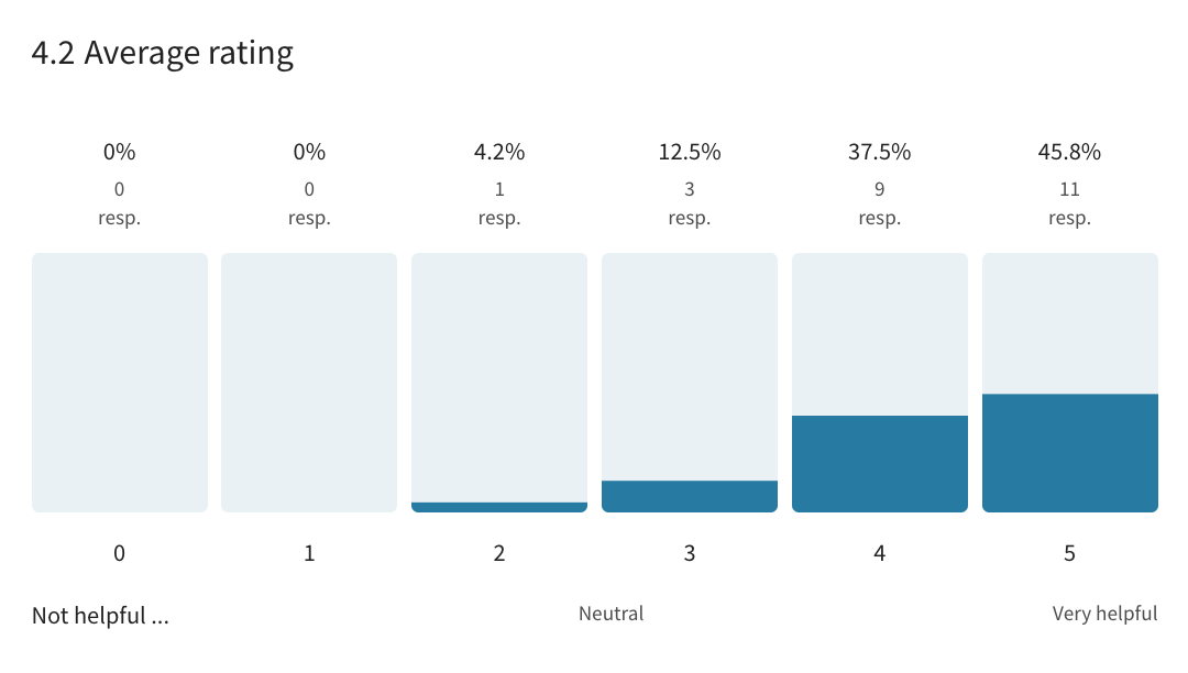 - Over 45% of respondents rated the community support as "Very helpful" (5), while 37.5% rated it as "Helpful" (4).
