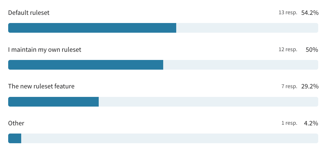 Most users rely on the default ruleset when using Falco, while a significant number of users prefer to maintain their own ruleset to tailor it to their specific needs. Others choose to take advantage of the new ruleset feature to further enhance their security. The flexibility and adaptability of Falco's ruleset options provide users with a customized and comprehensive approach to their security needs.