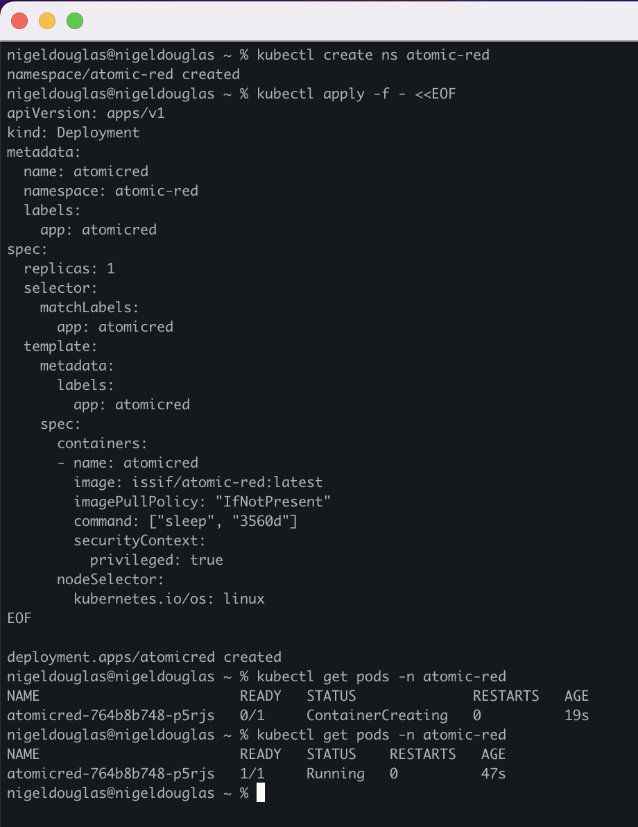 Note: This creates a pod called 'atomicred' in the 'atomic-red' network namespace. You can check on the state of the installation with the below command: