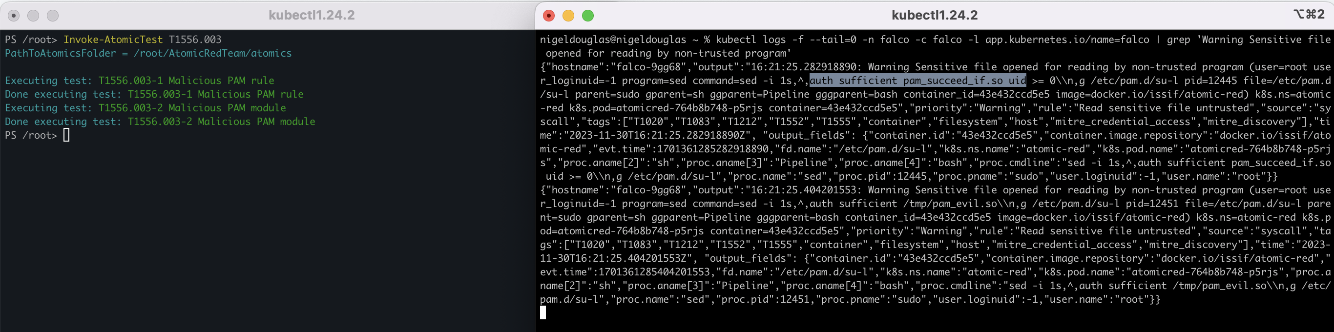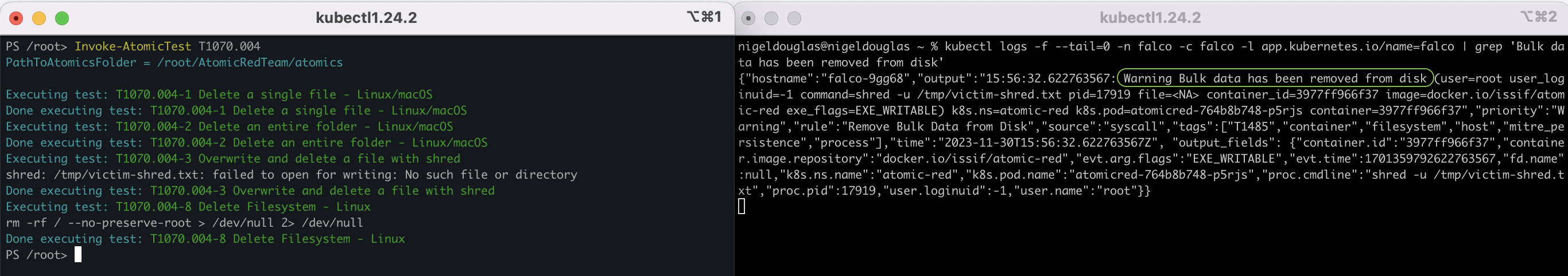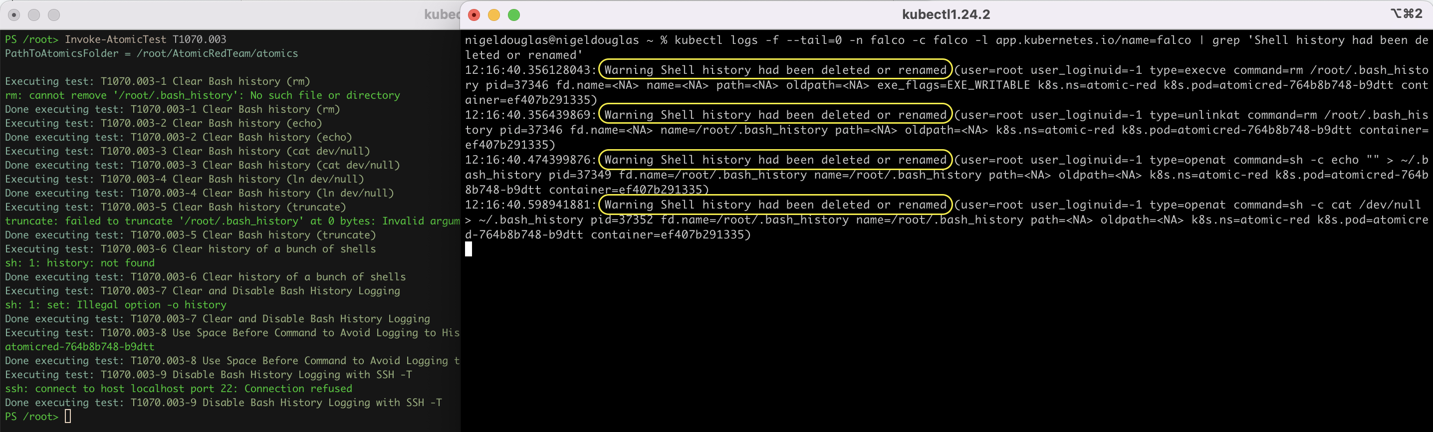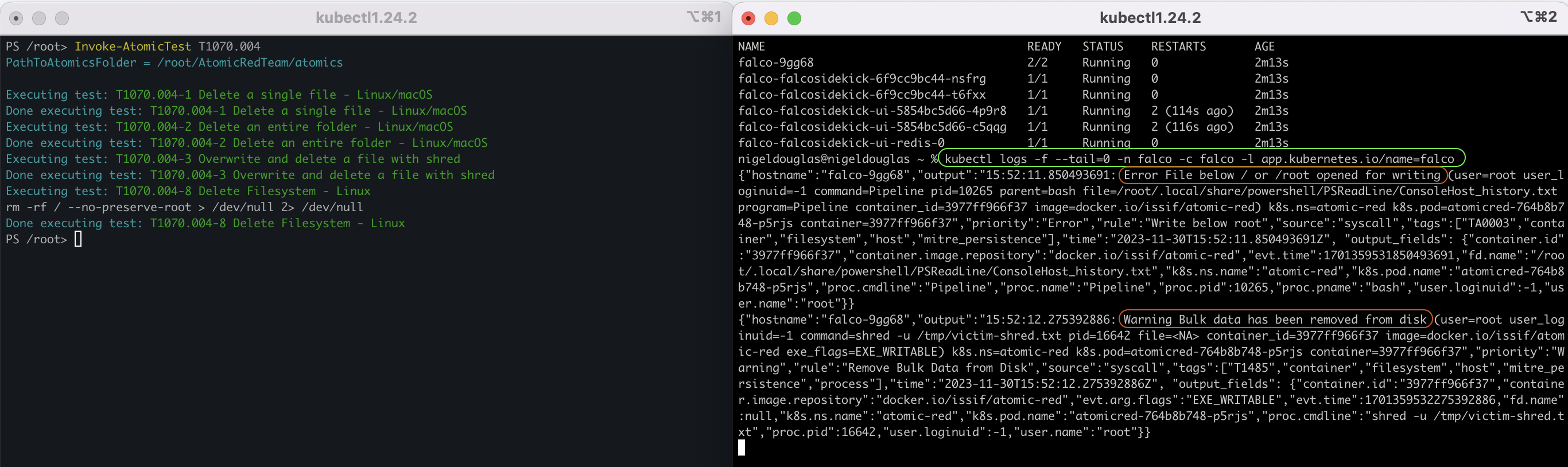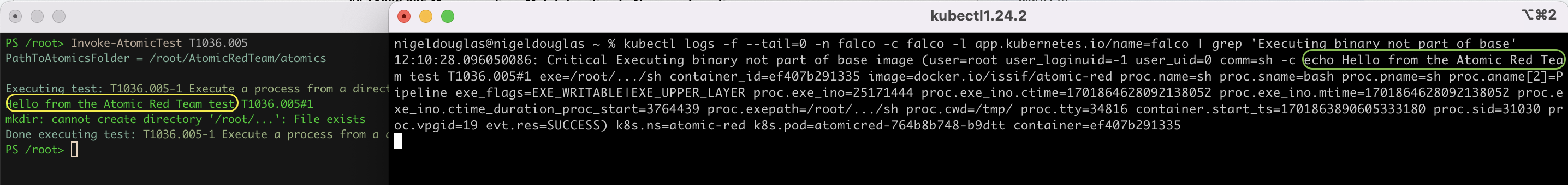 You can see that in the left terminal window, there is an echo message in the terminal saying '”Hello from the Atomic Red Team.”' Any string output in the command line can also be detected in Falco’s outputs.