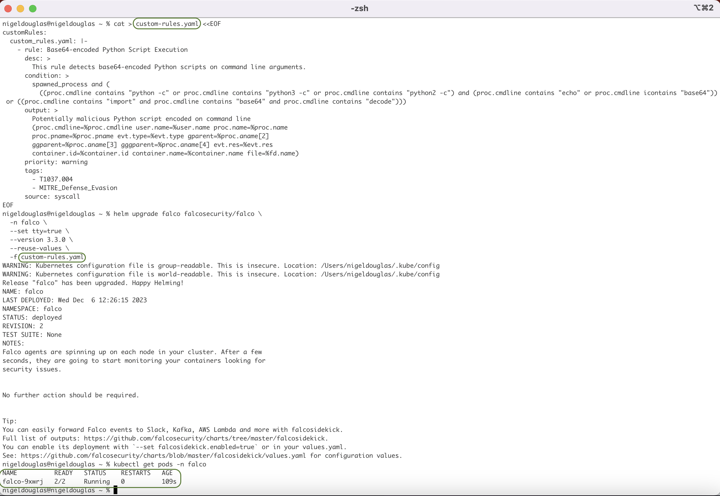 Let’s try upgrading Falco to reflect the 'custom-rules.yaml' file: