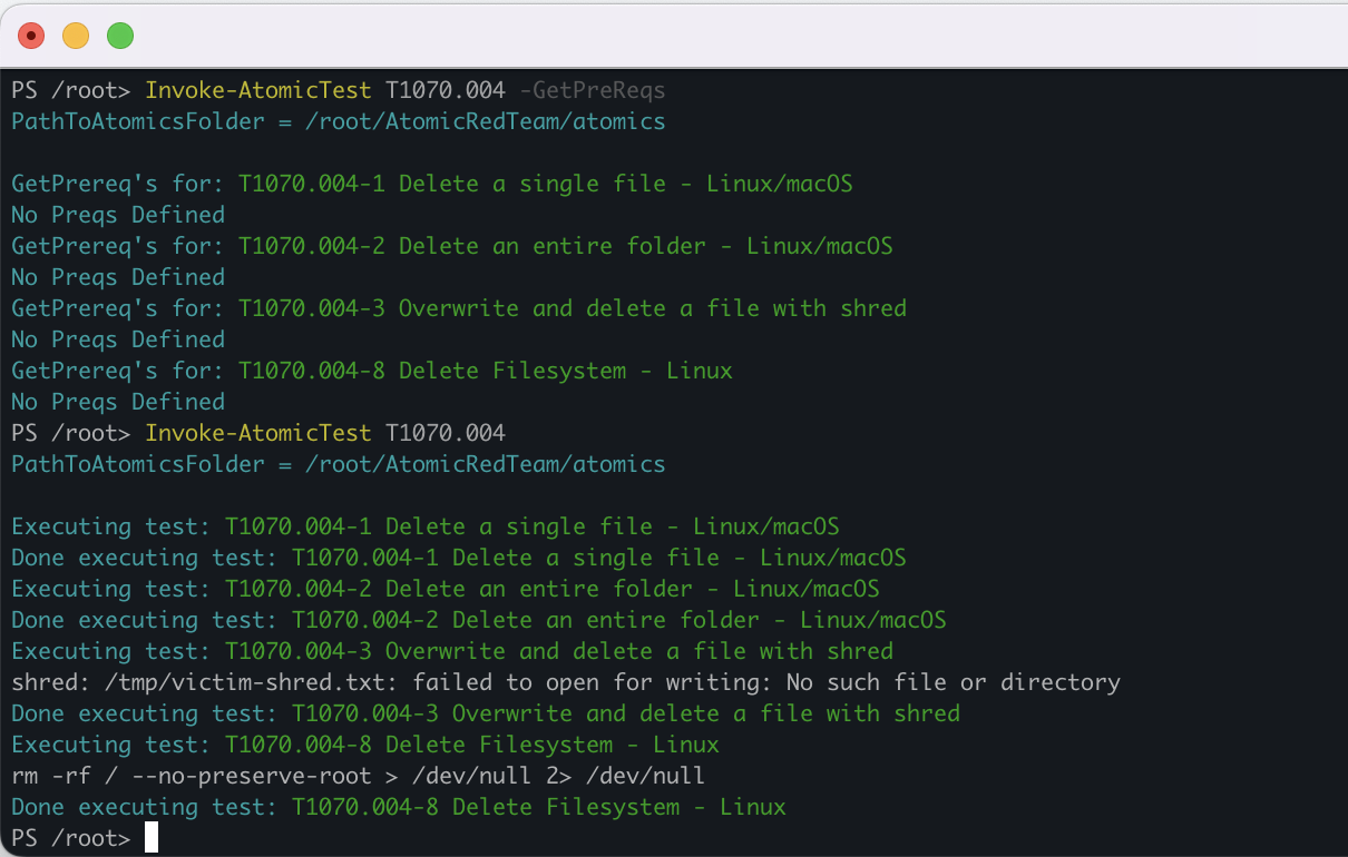 Jump back into the first terminal window and re-run the bulk file deletion Atomic Test - 'T1070.004':