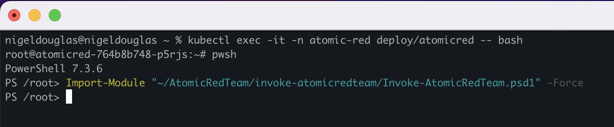 Once deployed, you will need to shell into the Atomic Red pod to perform the following test scenarios. This might seem a little confusing, but Atomic Red was developed with PowerShell in mind, so the below instructions ask the user to shell into a container, and once they are in the running pod, they must run Powershell to import and invoke the various Atomic Test Scenarios.