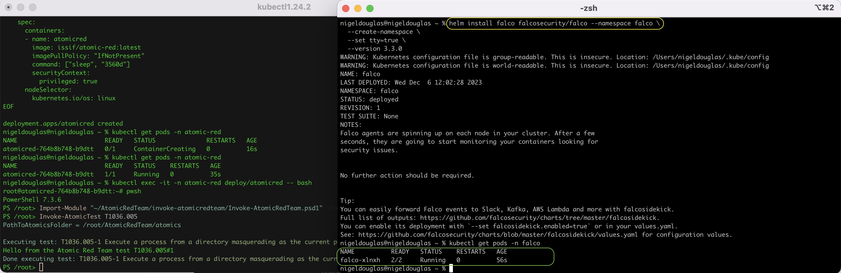 Congrats! Now that we know how Atomic Red works, let’s install Falco and run it side-by-side against Atomic Red to prove it detects these tests in real time. We will need to open two terminal windows to see the real-time response detections.