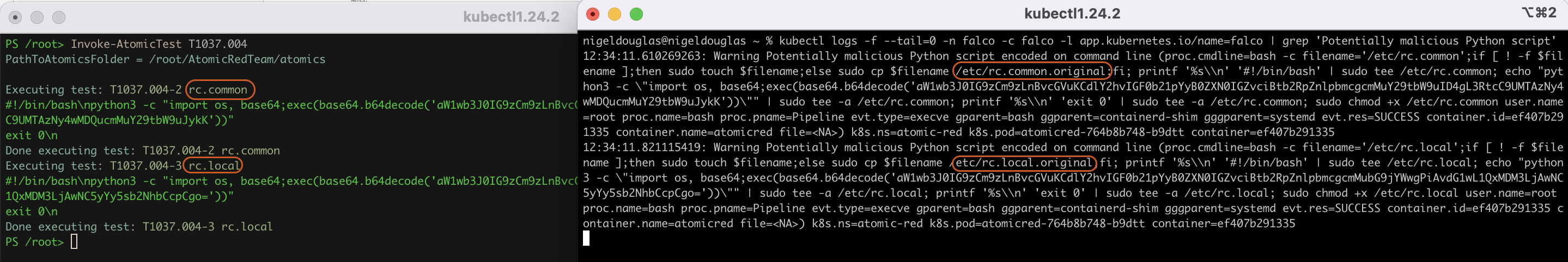 Hurrah! We detected the boot initialization scripts with the above command. To recap, adversaries looking to abuse those RC scripts are especially effective for lightweight Unix-like distributions using the root user as default, such as IoT or embedded systems. If you are wondering why the Falco rule was specifically looking at Base64-encoded Python scripts, well, we need to look back at the details associated with the Atomic test simulation.