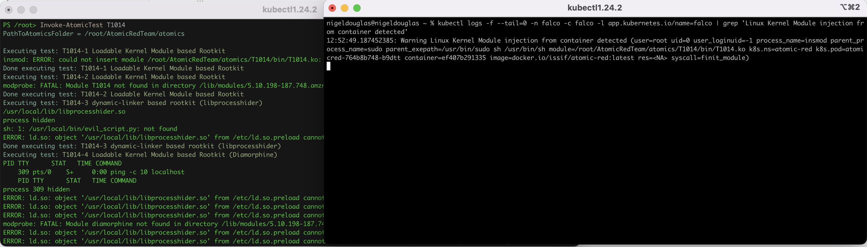 kubectl logs -f --tail=0 -n falco -c falco -l app.kubernetes.io/name=falco | grep 'Linux Kernel Module injection from container detected'