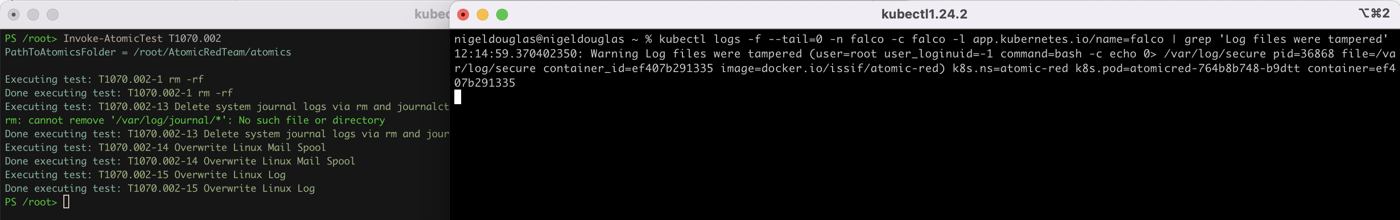kubectl logs -f --tail=0 -n falco -c falco -l app.kubernetes.io/name=falco | grep 'Log files were tampered'