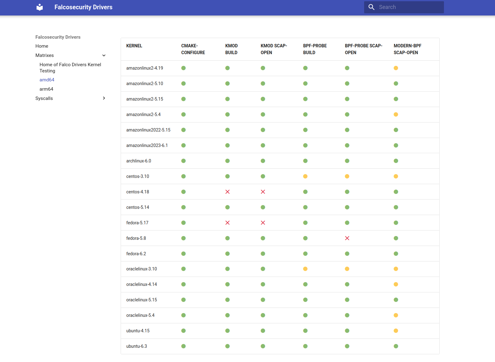 The end result can be seen at https://falcosecurity.github.io/libs/matrix/.