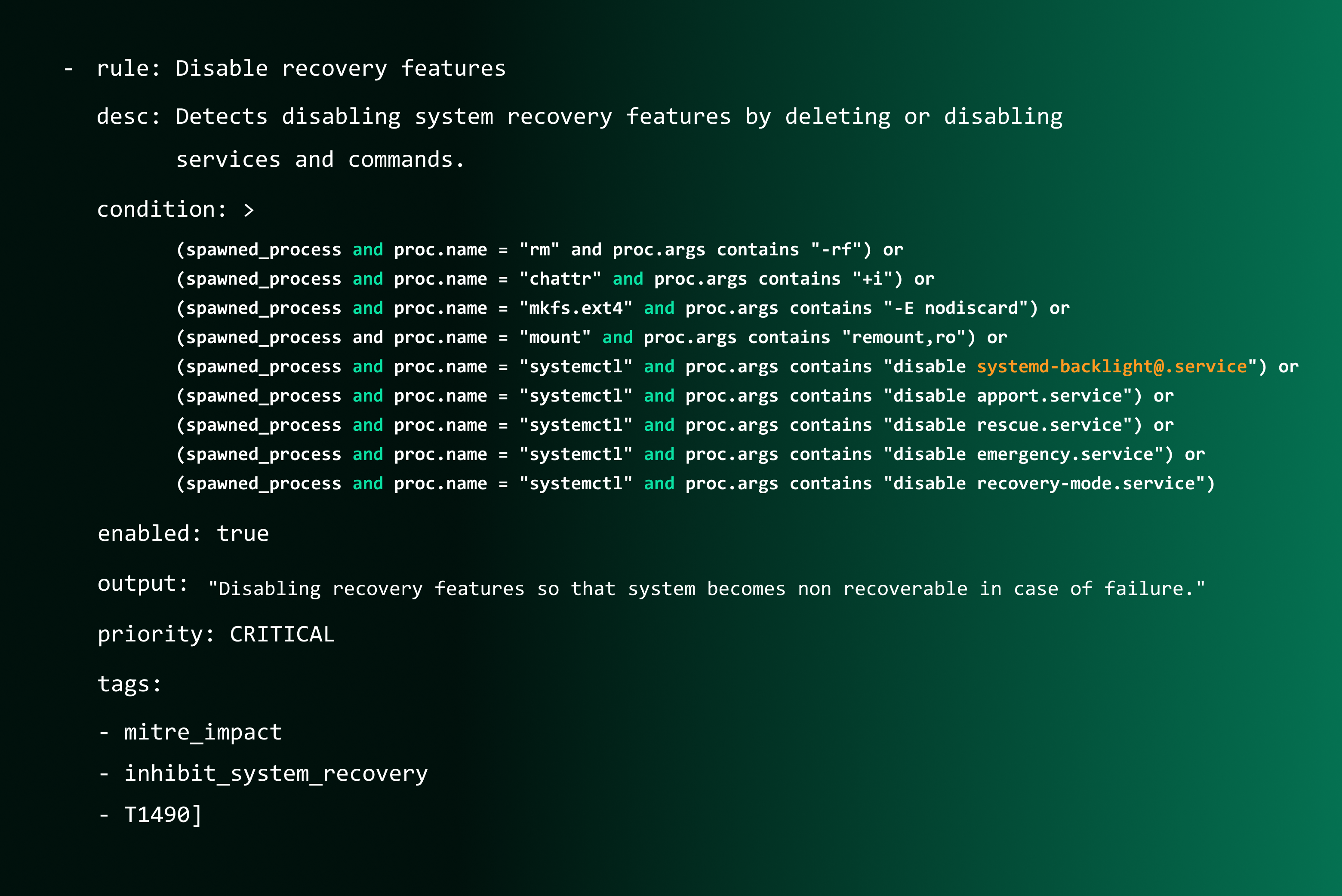Considering all these technical aspects and system changes that occur in a system when an adversary tries to inhibit system recovery, we can write a falco rule to identify these system events.