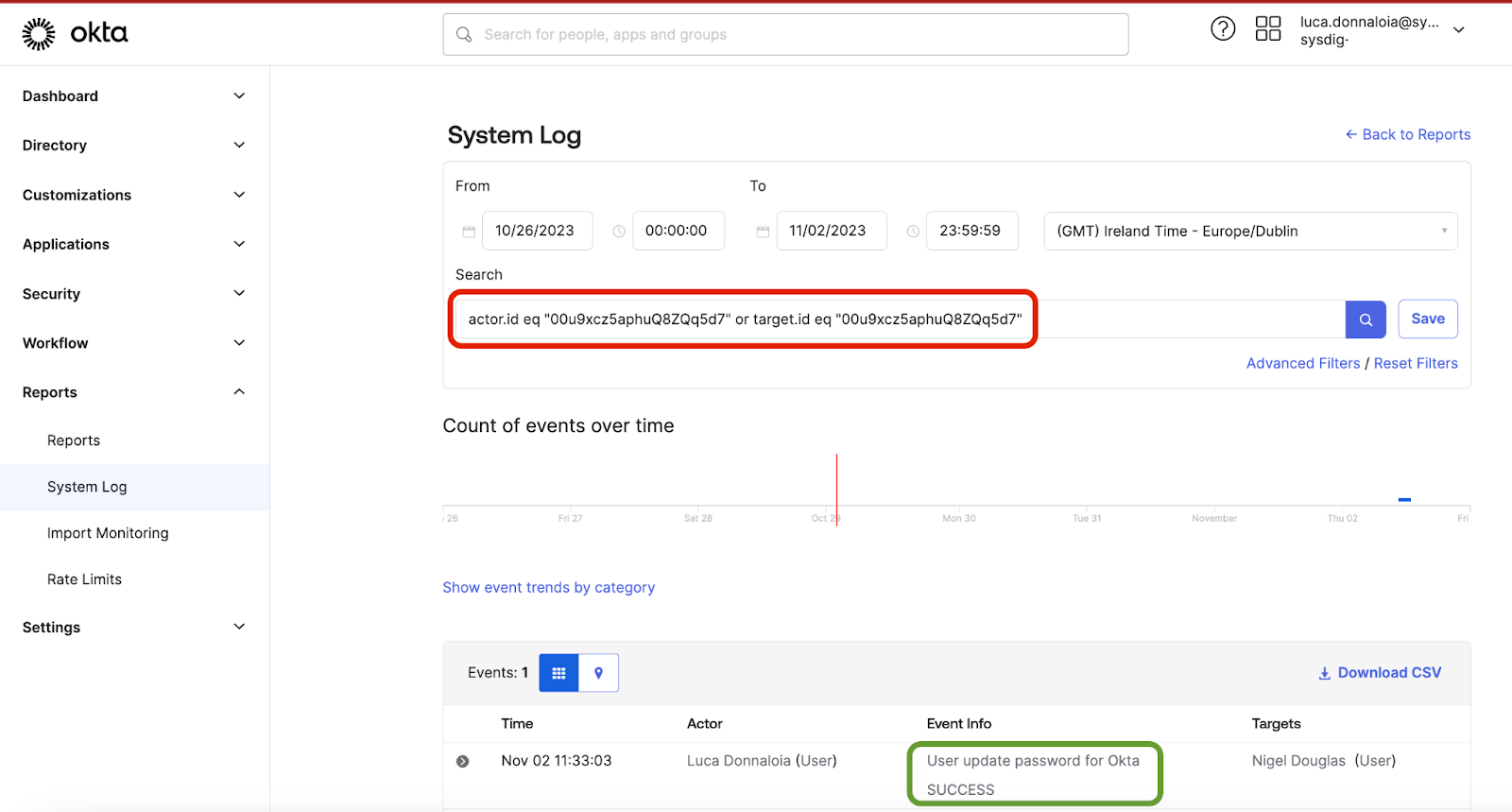 eventType eq "user.session.access_admin_app" and client.ip_address eq "78.xx.xxx.249" and target.id eq "00u9xcz5aphuQ8ZQq5d7" and outcome.result eq "SUCCESS"
