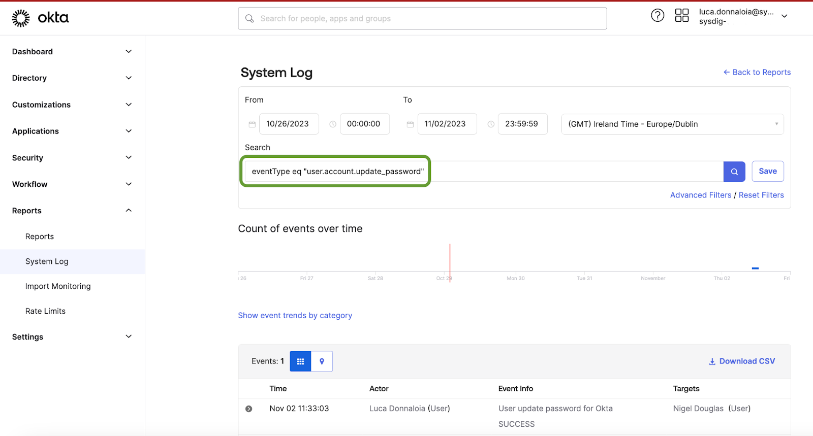 A typical illustration of the importance of these rules lies in the process of initiating a password reset within the Okta platform. In practice, an insider threat might reset a password, opt not to inform the end-user about the reset, and potentially carry out an account takeover in this context. Whenever a specific action is executed through the Okta user interface, there is a straightforward method to access the associated activity logs on the web user interface