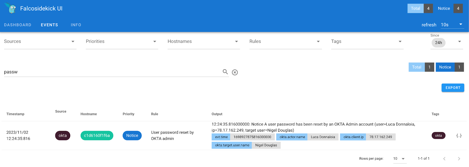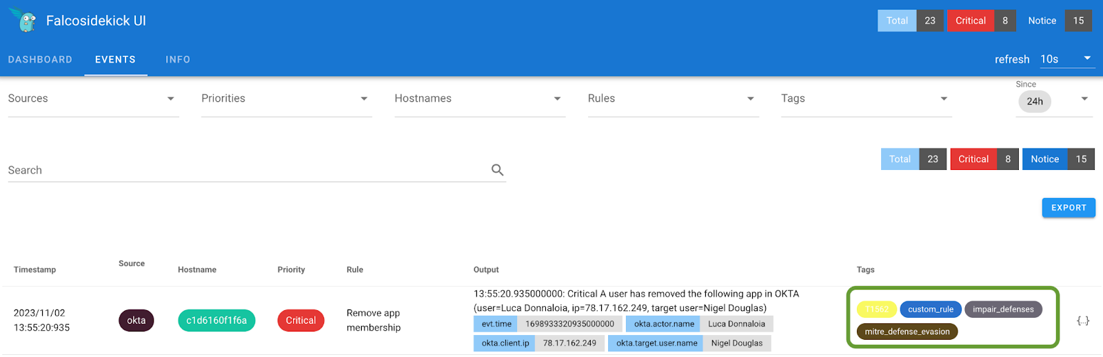 Here is the output displayed in our Falcosidekick UI, presenting the context of the actor's name and the corresponding IP address responsible for the change. It could be advantageous to explore the possibility of incorporating additional Output fields to enhance incident response capabilities when addressing identity threats.