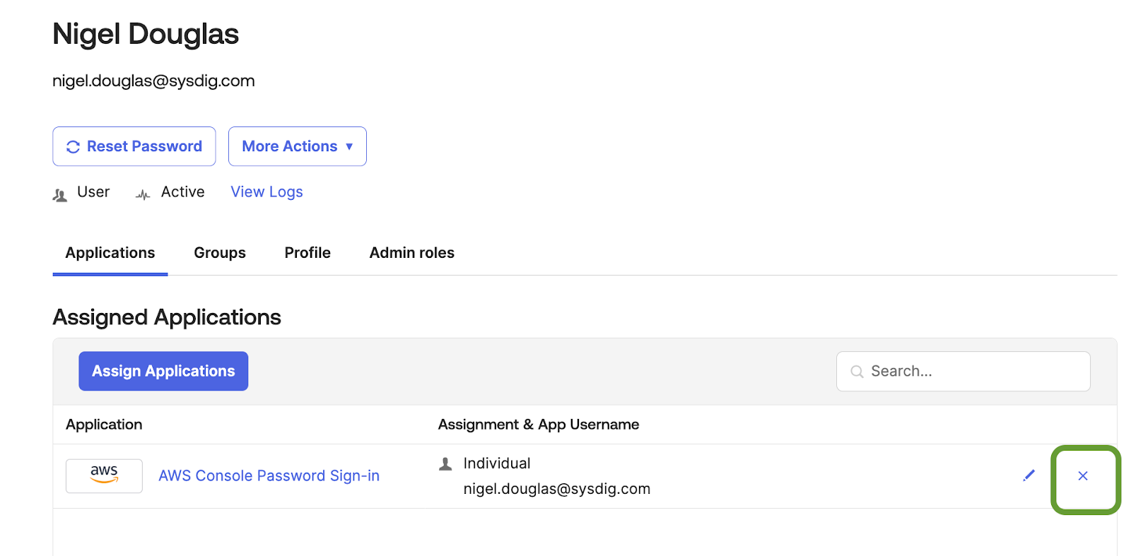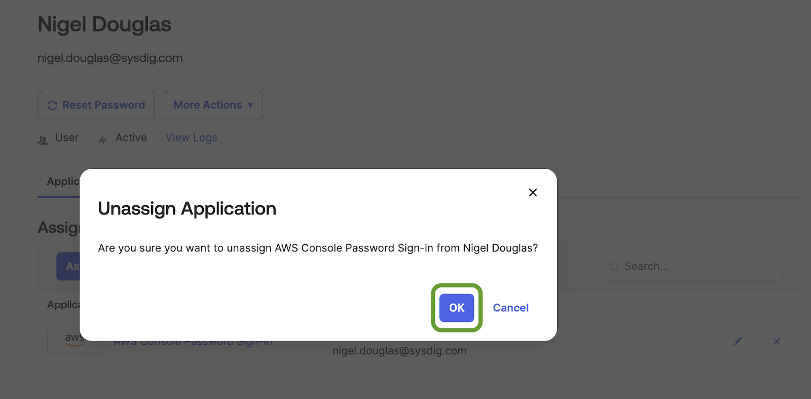 Consequently, we will replicate this specific action and create a custom Falco rule to identify such behavior. As shown in the screenshot below, the admin user is seen removing the application assignment from the user Nigel.