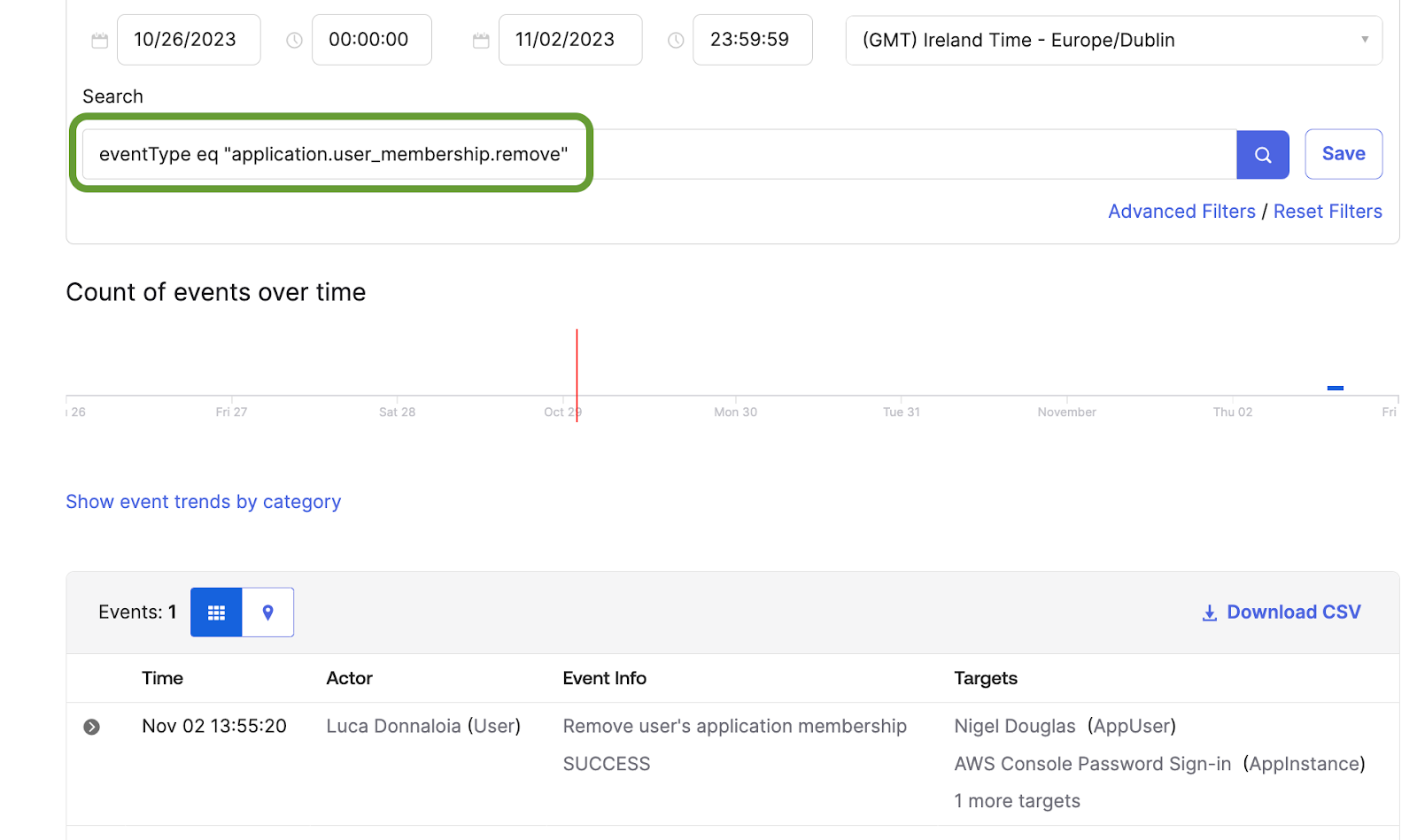 After the application has been unassigned, we receive the updated event type data in Okta, much like our previous workflow. The Okta query that provides the results of the application removal is as follows:
