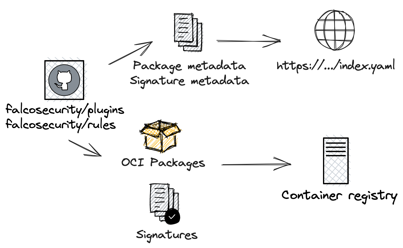 cloudtrail) to their location in the container registry (e.g.ghcr.io/falcosecurity/plugins/plugin/cloudtrail). If that entry is modified to point to an attacker-controlled registry, possibly alongside an attacker-controlled signature, clients will download a potentially malicious artifact instead of the official one. - At this point in time, the entire infrastructure is hosted by GitHub, making it a potential single point of failure and an entity that the Falco project completely trusts. However, even if parts of the infrastructure (container registry, CDN for index distribution, ...) were not, GitHub release pipelines would still have permissions or access tokens to operate those locations.
