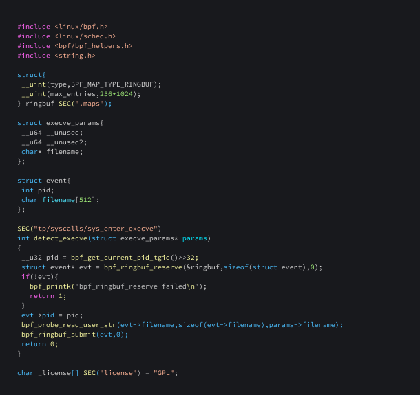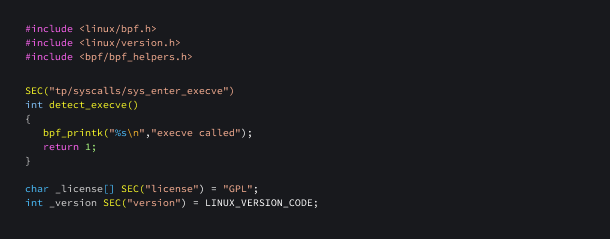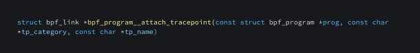 SECformat follows the patternSEC("tp/<category>/<name>"), where<category>and<name>represent the respective tracepoint category and event name.tp/syscalls/sys_enter_execverefers to a tracepoint that records when a process spawns the execve system call.A list of all the available tracepoints is present in the